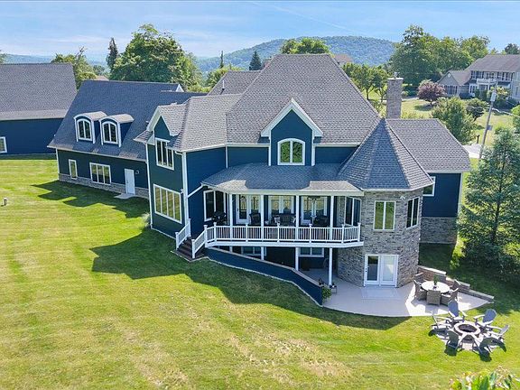 Nestled on just over an acre, this custom-built estate offers stunning mountain views and is an architectural masterpiece. As you drive up the tree-lined driveway, you are greeted by the expansive grandeur of the home. The exterior boasts Hardy plank concrete siding and stone along with an oversized three-car deep bay garage, with a utility sink and an EV car charger. A front paver firepit adds another space for entertainment. The 26 x 45 detached garage features oversized 12 x 12 automatic garage doors, w/ reinforced 6" thick concrete floor. An unfinished structural space above garage with complete utility access for future possibilities. A magnificent two-story foyer sets the tone for the elegance inside. The first floor features grand 8-foot solid walnut doors, elegant bullnose cornered drywall. The first and second floors are adorned with 5" wide hickory hardwood, with ceramic tile in the bathrooms, creating a cohesive and luxurious feel. The great room features built-ins, gas fireplace and access to the rear deck. Additional amenities include a complete whole-house intercom system, whole house audio, security system, central vacuum, and main level laundry room. The chef's kitchen features granite countertops, under-cabinet accent lighting, and 2 dishwashers, two ovens, warming tray, and wine fridge. The crowning jewel is a Bertazzoni 48" double gas oven with six burners and an electric griddle, complemented by a pot filler. The kitchen includes a breakfast bar and a large breakfast nook with breathtaking mountain views, perfect for enjoying a meal or watching the sunset. The gathering and entertaining possibilities are endless with a separate formal dining area. Master bedroom on the first floor is a sanctuary of luxury, offering a seating area, private bath with a 5 x 5 tile shower, air soaking tub, double vanity sinks, two walk-in closets and private access to deck. Ascending the front or rear staircases, the second floor boasts a charming balcony seating area, two bedrooms sharing a Jack and Jill bathroom, a convenient laundry chute, and walk-in attic access with climate control. The luxurious in-law suite offers an enclave of privacy and comfort, featuring a cozy bedroom, a serene living room, and a full bath, perfect for extended family or guests. Walk-out basement adds significant value and versatility with two bedrooms (ask listing agent for details), gym room, and room that can be used as an office or theater room, a full bathroom & 2nd laundry room in the utility area. Expansive game room includes a full bar along w/ refrigerator, kegerator, under-cabinet drink cooler, and liquor shelves with a decorative tile backdrop. Enjoy a pool table/ping pong area, TV viewing area and a pellet stove for chilly evenings. French doors provide direct access to the rear entertaining area on the patio, with grilling area and fire pit, perfect for outdoor gatherings. This home is built with the highest standards of construction, including poured solid concrete walls, 2 by 6 framing and engineered floor and roof trusses, foam insulation, geothermal heating/cooling, desuperheater for hot water, and a whole-house Honeywell air exchanger, 400 amp service and is wired with Ethernet and two runs of RJ45 cabling for cable and digital reception from an attic steerable HD antenna. Front and rear windows tinted for UV protection, enhancing energy efficiency. The sewer system is a low-profile Peat filter system. Well has a UV light, acid neutralizer, and softener, and whole house radon system. Conveniently located near major commuter routes, making it ideal for those who need to commute for work or leisure. Outdoor enthusiasts will appreciate the proximity to skiing and golfing, providing year-round recreational opportunities. Every detail in this home speaks of quality and craftsmanship. This home is not just a residence; it's a statement of living beautifully and comfortably. Indulge in the life of luxury. Your new home awaits.