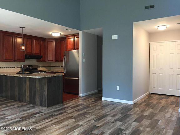 This beautiful private end unit is a ranch-style townhome located in the Tall Timbers neighborhood of Great 08087. It features two bedrooms and one bathroom, along with a stunning living and dining area that boasts vaulted ceilings. The lovely kitchen offers plenty of counter space. The main living area has wood-like porcelain tile flooring, while the bedrooms are carpeted. The townhome is equipped with forced air natural gas heating, central air conditioning, and newer appliances. Additionally, there is a patio at the rear of the townhome that overlooks the woods.