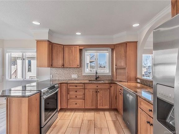 Gorgeous and rare offering at Whalers Pt Enjoy water views from every bedroom, your own private beach across from Kelsey Island and the quiet of a small complex. Owner has meticulously maintained and updated this townhouse throughout. Some upgrades include: California closets, custom window treatments, re-built Azek multi-level deck and balconies, remodeled kitchen and baths, heated kitchen and bath floor, refinished hardwood flooring and new carpeting, new furnace, new tankless water heater and CAIR, gas-heated garage with sealed attic (great storage can be used as a rec room, new stone front patio, Bluestone stairs, re-painted throughout, new stone fireplace. Stunning Master bedroom feels like a resort, cathedral ceiling, gas fireplace and balcony with incredible views. Take a short walk to Cosey Beach and The Lobster Shack, Farm River State Park, or take out a kayak, what a find