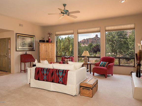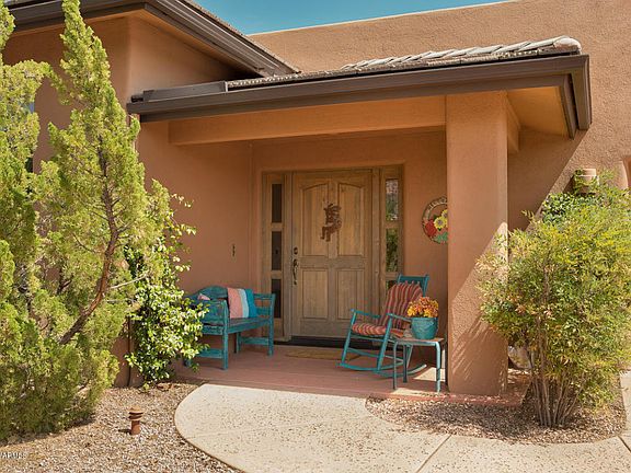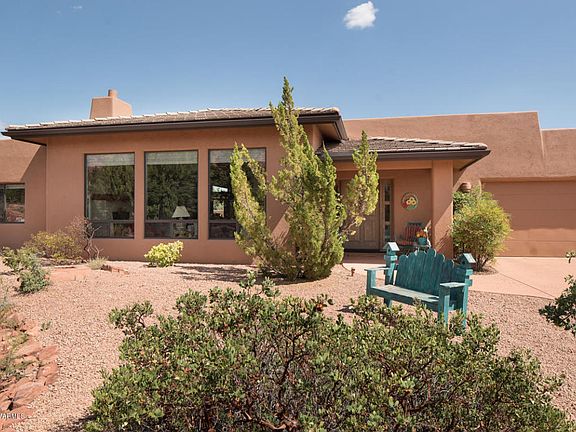Newer Santa Fe style home in Crimson View subdivision with privacy and red rock views! Immaculate designer interior features new wood flooring, new cabinetry and countertops and is spotlessly clean. Surrounded by mature landscaping, this well designed home sits on a large corner lot and is situated perfectly to see Thunder Mountain and Coffeepot Rock from the living room. Open floorplan is perfect for entertaining with its open kitchen, spacious rear patio and views all around. Other amenities include: split bedroom floorplan, loads of storage, private back patio and an oversized garage with shop. Situated just minutes away from National Forest trails and all the amenities of West Sedona, this location is in the center of a desirable newer subdivision. Have a look today!