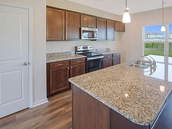 Welcome home to this five bedroom, three bathroom home with 2,237 square-feet of living space! Upon entry, you will be greeted by upgraded luxury vinyl plank floors that extend throughout the entire first floor! The open concept family room opens to the kitchen and eating area! The crown molding and window casing make this home even more beautiful! There are upgraded cabinets throughout the home. The kitchen and master bathroom feature granite counter tops! There are also stainless steel GE appliances in the kitchen! The full yard irrigation and covered back patio make relaxing a breeze! The guest suite downstairs is great for company! The master suite has vaulted ceiling and the master bathroom has dual vanities as well as a garden tub and separate shower! This home is a must see!