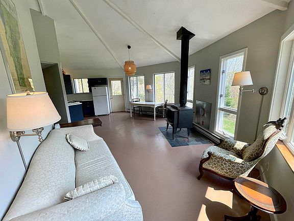 Nestled in the hills of South Strafford, Vermont, this can be either a full time or seasonal property. The single level home has both electric baseboard heat and a wood stove. Three bedrooms with closets and a full bathroom as well as laundry facilities in the primary bedroom's closet make occupying this property seamless if traveling from afar or arriving home from a long day's work. The 3.49 surveyed acres include a portion across the road from the main lot, adding to privacy and creating a barrier against potential future development. A large barn with an open attached four car garage has a poured-floor workshop as well as an upstairs space that is currently being used as a personal library. Either floor (at 900' each) could, with permitting, be converted to a living space. Electricity and phone are installed and septic and water lines are buried out to the barn. The yard space is open and level, with walnut, chestnut and apple trees, as well as Rose of Sharon. A shed adjacent to the garage holds property maintenance equipment. A private location but ten miles from Routes I91 and I89 and 29 miles from Dartmouth/Hanover. If you're looking for a balance between nature and convenience, this may be the property for you.