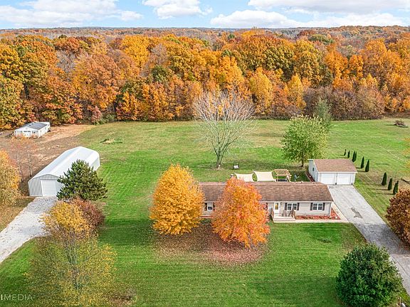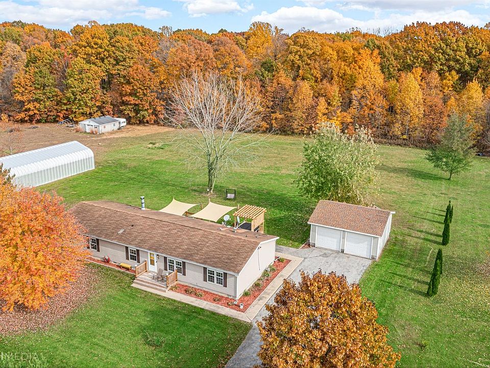 GOREGOUS 3-bed/3-bath ranch with 1,800-SQFT POLE BARN on two acres backing up to the woods! Vaulted ceilings & plenty of daylight flow throughout; from the sprawling living room to the open-concept eat-in kitchen (custom ceramic counter, pantry)/dining room/family room (wood burning fireplace) that walks out to the deck and patio overlooking your BREATHTAKING backyard retreat; the perfect place to entertain friends for a bonfire this fall or enjoy your morning coffee! All three spacious bedrooms feature en suite baths, including the stunning master bath with whirlpool tub & custom tile vanity! The laundry room (hideaway industrial barn door), office, den & additional full guest bathroom round out your interior living space, while the 2-car garage features a workshop and plenty of extra storage space. The MASSIVE, NEW pole barn is big enough to house all the essential toys necessary for enjoying this beautiful property, plus a storage shed, electric fence for the fur babies & much more!