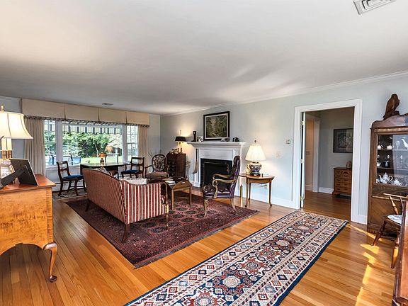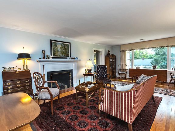 Set high above its neighborhood street, with a broad expanse of level front and back yards, this quality brick ranch offers on the level living within walking distance to downtown Peterborough. Well maintained, its bright and airy interior is move-in ready. Hallmarks of its construction include hardwood floors, crown molding, central AC, Buderus furnace, central vacuum and whole house automatic generator. Recent roof and town water and sewer. Front entry to fireplaced front to back living/dining room. Expansive granite countertopped kitchen with Wolf gas range, dishwasher, and refrigerator. Adjacent Laundry closet. Pass through to the family room with skylit, vaulted ceiling and sliders to the Trex deck with awning. Pocket doors separate off the office. Primary bedroom has a dressing room and private shower bath with "his and hers" vanities. Guest bedroom and shower bath complete the main floor. On the lower level is partially finished space with half bath, now used for storage, and unfinished utility area. Attached two car garage has utility sink for gardening and projects. Detached 16' x 24' outbuilding. Occupancy 11/13/2023.