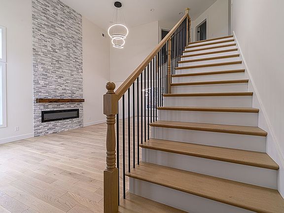 Striking statement fireplaceModern detailsVersatile bonus roomTiled walk-in showerComposite deckLaundry roomPrivate backyard