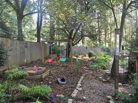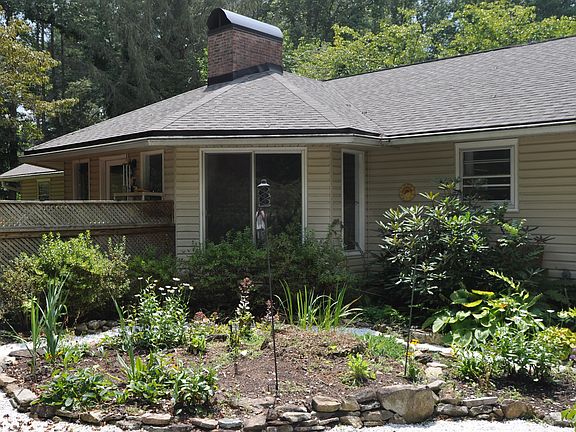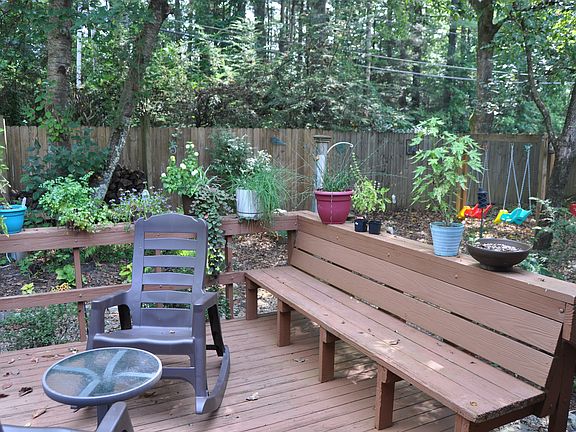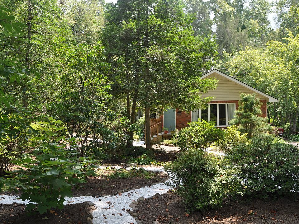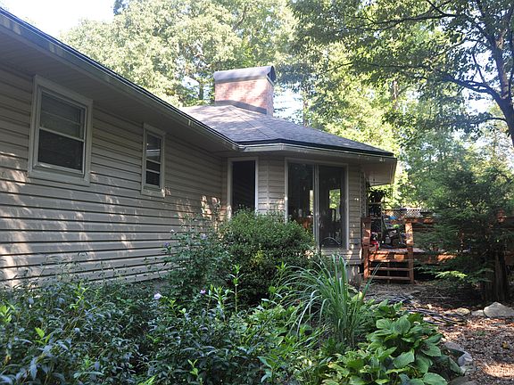3 bedrooms, 2.5 baths, large living room and dining room, den with vaulted ceiling and massive masonry wood-burning fireplace. Kitchen recently redone with new cabinets and countertops, nice breakfast area overlooking wooded, fenced backyard. Just under half an acre (.46) natural yard with paths and many unique and native plants.