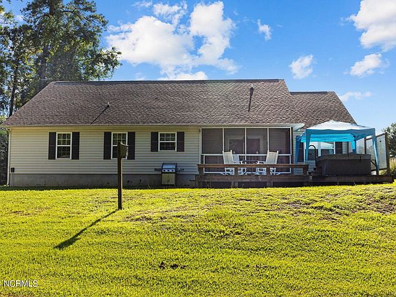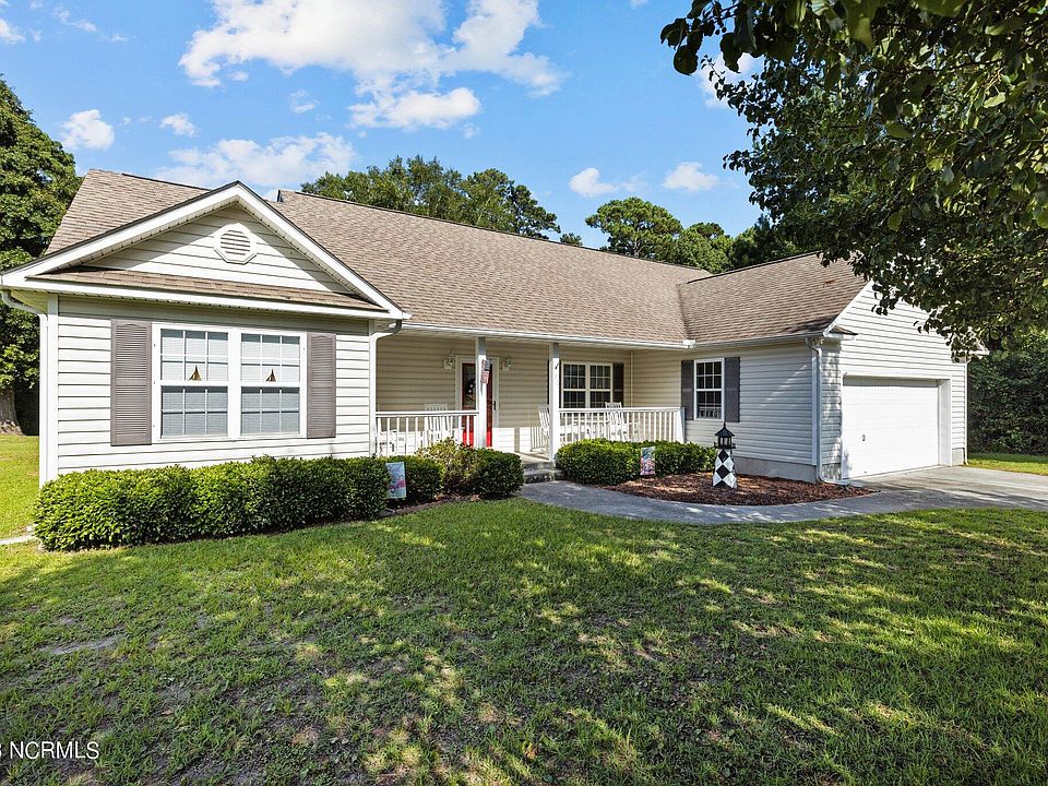 WELL MAINTAINED, ONE-LEVEL HOME IN CROATAN SCHOOL DISTRICT! The split floorplan offers open living areas and a large principal suite with dual vanities along with a walk-in closet. Outside, enjoy a lot of space to kick back and relax on the large front porch, screened porch and deck, complete with a hot tub. There's plenty of storage with a full two-car garage and an 8' x 10' shed. Just 10 minutes to Emerald Isle beaches!