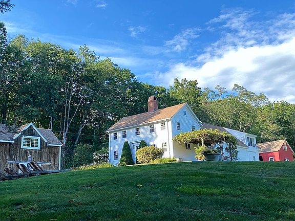 A first period colonial Maine farmhouse with 6 very private and beautifully landscaped acres but just minutes to NH and Maine beaches and Portsmouth, NH's Market Square, an hour to Boston and only 45 minutes to Portland. This house is totally updated but retains historic features such as heart-pine floors, gunstock beams, 4 original working Rumford fireplaces, plaster walls, original casings and trim and the original hand-made doors and latches. Updates include all Pella Architectural Series 6 over 6 insulated double-hung windows, new custom milled exterior French doors, new central heating, new plumbing and bathrooms, fairly new 60 year architectural roof shingles, fresh paint in and out, whole house water softener and filtration, 200 amp electric service with whole house generator transfer switch and whole house surge protector, freshly refinished or new wood floors and recently sprayed foam or celluslose insulation in all exterior walls, the basement and attic . A two-story timber framed barn was constructed in 2022 with power and year round water. There is a separate 1 bedroom rental over the attached garage, a two-story poolhouse, an inground gunite pool, a spring fed & stocked pond and a fenced in raised-bed vegetable garden with a garden shed. A large scale $50,000 re-scaping was done in 2019 that consisted of a new semi-circular driveway, paver hardscaping and new plantings. Both chimneys were repointed and topped with brick "bishop's caps" 2 years ago. The custom chef's kitchen includes a commercial 6 burner, double oven/ griddle/ broiler range, quartz and wood countertops and separate pantry. Two of the 4 bedrooms have working fireplaces, one guest bedroom measures 18 x 24. The dining room has French doors to a pergola covered brick patio; the living room has an original working fireplaces. There is a TV room with French doors out to a new deck, a downstairs bathroom with a custom concrete shower and heated floors. And a second large living/ music / art room with its exposed timbers and barn board. The second floor spa-like bathroom includes a separate soaking tub looking out a bank of windows at the fields and old apple trees. The second floor also includes the laundry room and a custom linen closet. There are 3 staircases leading to the 2nd floor including the beautiful original 18th century one.