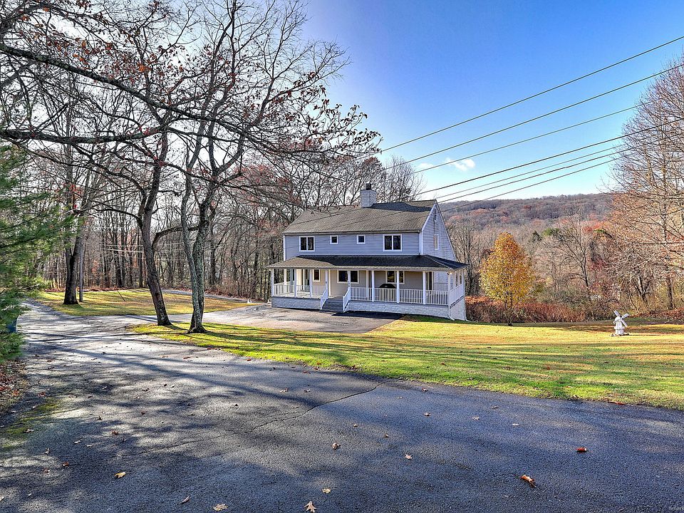 Suburban charm awaits you as you tour this beautiful three-bedroom, two-bathroom split-level colonial on a spacious 8.5 acres. This home offers approximately 2,400 square feet of living space and features a spacious porch, scenic surroundings, and is ideal for subdividing for separate housing or building lots providing a serene and peaceful living environment. Upon entering this beautiful home, you will overlook a spectacular Great Room with hardwood floors, a gas fireplace, vaulted ceiling and a wall of windows providing abundant light, adding warmth and ambiance in this great entertainment space. From the Great Room you walk out onto a two-level deck that offers additional opportunities for entertaining and enjoying nature. The kitchen is located on the main level and is equipped with stainless steel appliances, granite countertops, ample cabinetry and tile flooring. The adjoining dining room has French doors that open onto the wrap-around, lighted deck offering another tranquil and secluded spot that is accessible from multiple rooms. A full bath is conveniently located on the main level. On the upper level you will find a generously sized primary bedroom and two additional bedrooms. The main bathroom has a large soaking bathtub along with a walk-in shower. A walk-up bedroom completes the upper level of the home. Under the home is a large two bay garage leading inside to a storage room with lots of built-in shelving and the laundry room.