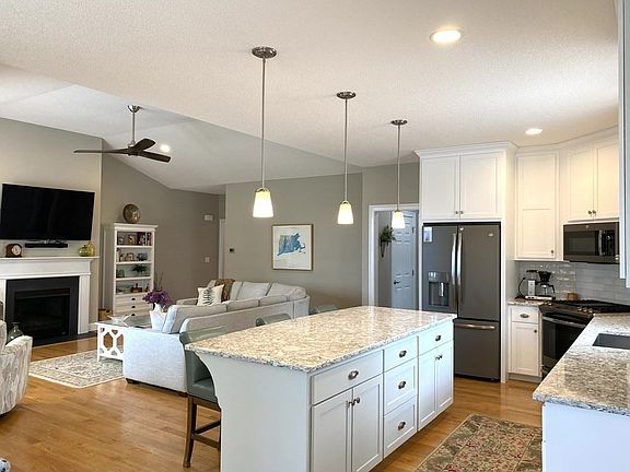- Kit Dscrp: Flooring - Hardwood, Countertops - Stone/Granite/Solid, Breakfast Bar / Nook, Kitchen Island, Open Floor Plan, Lighting - Pendant