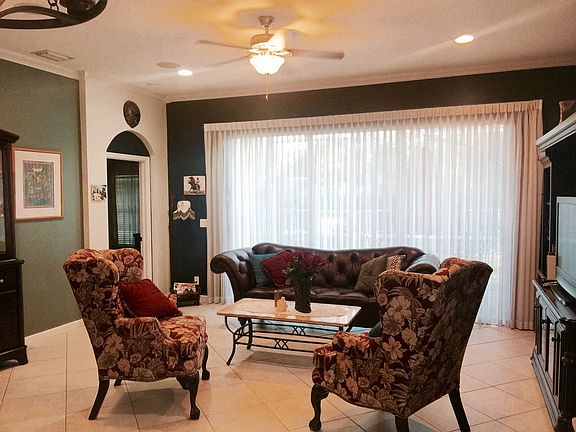 Situated in a manned gated community with access to many great amenities. This charming home is nestled along a quiet cul de sac among beautiful Florida palms. With a newly painted exterior and refreshed landscaping, you will feel welcomed immediately. This home offers tile flooring throughout, crown moulding in great room & kitchen, a beautiful brick patio with a retractable sun awning, and a peaceful backyard bordering a canal. Master BR has two walk-in closets, each with custom built-ins and a beautfiul Roman tub. Refrigerator new in 2018. Close proximity to Mall, FL TP, Equestrian facilities, and A rated schools!