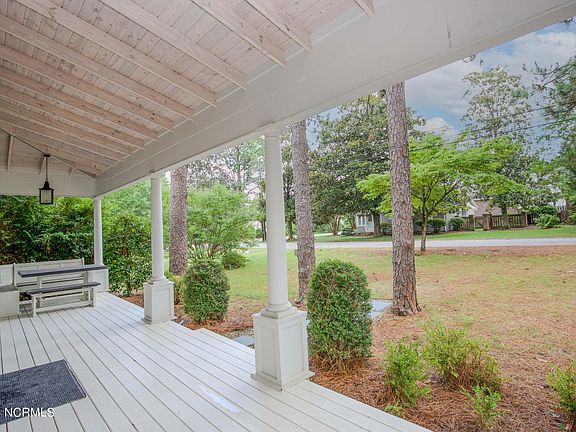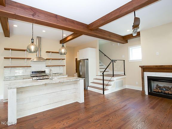 Welcome to this inviting newer Downtown Southern Pines home, featuring a covered front porch and an architecturally designed interior. The open main floor is perfect for modern living, boasting beamed ceilings, pine flooring and a beautifully whitewashed heart of pine island with marble counters in the gourmet kitchen. Stainless steel appliances, walk in pantry, built in laundry area and a natural gas fireplace add to the appeal. There is a ample dining alcove with natural light for family and friends to gather. The primary suite offers a serene retreat. There is a generous walk in closet, with laundry chute. Enjoy the soaker tub, tiled shower with rain head, double sinks and private toilet room. A stylish powder room and a bag drop area off the side door complete the main level. The side door leads to a double garage and a shared driveway, ensuring convenience and practicality. Upstairs is spacious with three additional bedrooms, a dedicated office, and a luxurious bathroom featuring double sinks and a tiled shower. Located just a short walk from the vibrant restaurants, bars, and shops of Downtown Southern Pines, the trails of Weymouth Woods Boyd Tract, Youngs Rd for equine enthusiasts, runners and cyclists, this beautiful home combines timeless charm with modern amenities in an unbeatable location.