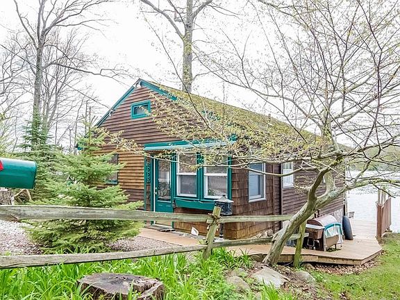 REDUCED $15K ~ WATERFRONT ~ Amazing 830 square feet of everything you need including 100 feet of waterfront frontage abutting state property extends the property and offers privacy on both sides. Light filled interior and open floor plan looking right at the lake. The main floor offers unique reclaimed wood paneled walls, gleaming hardwood floors, sliders to a wrap around deck, bedroom & a full bath. A spiral staircase takes you downstairs to the walk-out lower level (230s.f.) rec room, currently used as a 2nd bedroom, along with a cedar closet and laundry room. Enjoy an outdoor shower, patio, flowering gardens, garden pond, tiki hut/cabana, picnic space, floating dock and the LAKE! Start enjoying this season!