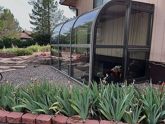 This home is now listed with Keller Williams, agent Tara Fish 928-599-1808 from the Prescott Office. Professional photos, drone and 3D walk through video was shot today, so please check for a new listing Thursday or Friday this week with the additional data. Also, Sedona.Org, a professional rental agency did an assessment of the rental potential. They feel 116,800.00 to 146,000.00 per year based on a walk through, careful assessment and comparison to other properties that they manage / rent here in Sedona. Open House Saturday, 6/11/22 Rodale press home In the West Sedona Kachina subdivision designed to be solar ready with correct roof angles, home positioning and shade producing overhangs. Home has 2 kitchens and a sliding door that separates the upper and lower levels. When split the main level consists of 2 bedrooms, 1.5 bathrooms with front and rear door access and the ground level is 3 bedrooms, and 2 baths with a private entrance. Each unit has one ensuite and one kitchen and one wood burning stove with glass door. The main floor has a large AZ room with views of Cockscomb. The ground floor has a solarium with a tiled floor and drains for gardening. Solar power (6.9 Kw) is leased from Solar City with guaranteed production 20921 Kwh at 11.7 cents ea for current year which lowers the electric bill by approximately $100 / month. There is an oversized 2 car garage with built in storage and large windows (views of cockscomb). There are 2 driveways – 1st to garage and main level, 2nd to backyard and ground level. There is plenty of room in the second driveway for a large 5th wheel or class A motorhome and 2 additional vehicles. There are a Hot tub off the main level with separate access from the lower level and a large Salt water above ground swimming pool – 21 foot diameter. Adjacent to the pool is a fire pit with sandy beach. There is also an observation tower with views of Cockscomb, Thunder Mtn and Other Red Rock Formations. The property has Large Old Growth trees including Aspen, Pinon Pine and Cedar and the feeling of a secret garden with multiple sitting areas and fruit trees. There is also an Organic Garden and partially restored greenhouse ( New remaining building materials have been purchased and are on site to complete this project). Attached to the main house are a large workshop room and separate large storage room. There are three additional free standing storage sheds on this very private lot. This could be a great owner occupied 2 family or short term rental property. No HOA.
