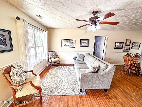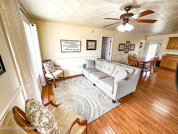 Nestled on 1.85+/- acres, this gorgeous 3 bed, 2 bath 1747 sq. ft. ranch Is a show stopper! Boasting stunning lake views from the front porch and ample space for outdoor activities, this home has unlimited options. Just minutes from WK Parkway and Leitchfield, the tranquility of the country this property provides is a rare find. As you enter the home, you find a large great room with hardwood floors. The primary ensuite is to the left and 2 additional bedrooms and bath are privately located on the right side of the home. Both bathrooms have been beautifully updated. The kitchen opens to a private deck overlooking the cozy fire pit, mature trees, and even a tree house! The hall adjacent to the kitchen leads to a room with over 300 sq. ft. currently used as a family room, but the options for this space are endless. A 30' X 40' detached garage boasts a concrete floor, loft area, and extended roof that could be used for storage or a porch/entertainment area This incredible home offers something for everyone.