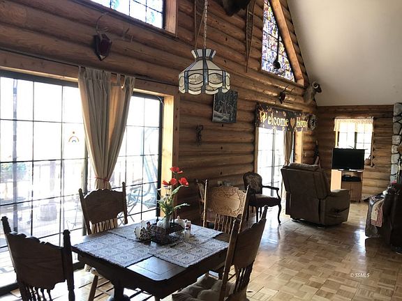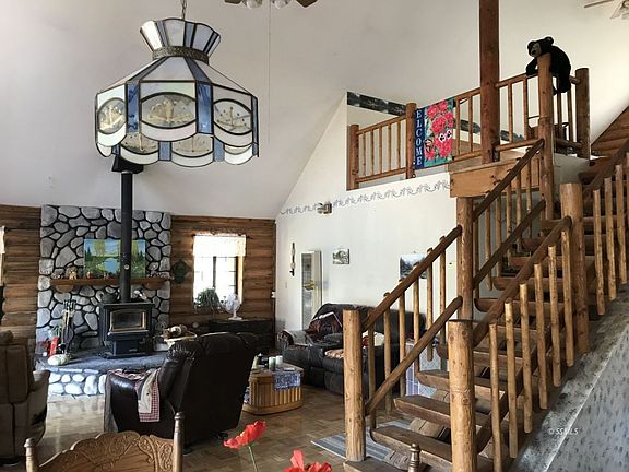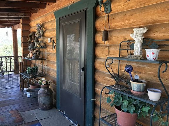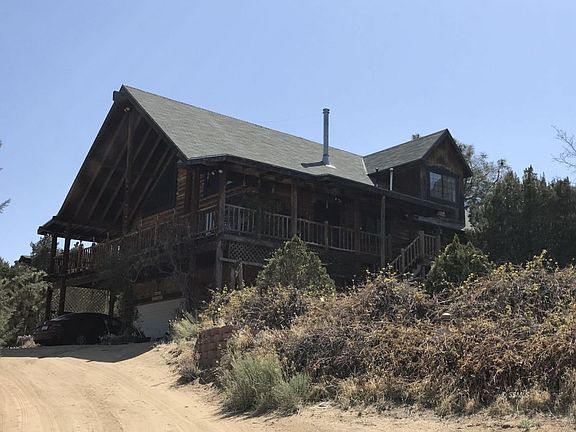 This Wonderful A-Frame Log Home sits on 7.5 acres and has 360 degree views. The Cabin is 1976 sq ft with a guest house down the hill. Both have attached garages .The main home has a beautiful vaulted ceiling's in the living room, with large gorgeous windows, a free standing woodstove set in a gorgeous rock hearth and two sliding doors leading to beautiful wrap around porch. The log staircase leads to a huge loft with closets, dormer and plenty of light from numerous windows. Kitchen has plenty of counter space and open to dining area. There are two nice sized bedrooms with master having a door to outside, lg walk in closet and bath with jacuzzi tub and separate shower. Ground level features a garage and laundry room w/summer kitchen. Guest house has 2 bedrooms, 3/4 bath, tankless water heater, propane wall heater and attached 900 sq ft garage. The home and guest house have separate solar systems. There is a 5000 gal water tank w/fire dept connection at well & tank. 1000 gal propane tank is owned. There is a 2nd well by the creek, no pump. Power is from Wind, Solar, Diesel generator. 24 Volt system for solar w/4 K inverter. 12Volt system in guest house. .