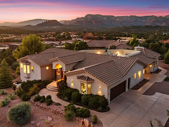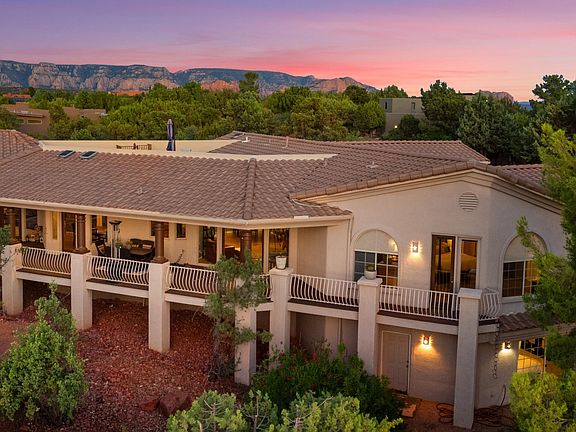 Perched on a hill in Sedona's prestigious gated Foothills South subdivision, this 3859 square foot home showcases elegant mediterranean inspired architecture, fabulous sunsets, and red rock views. Upon entry, a grand foyer opens into one of two expansive living areas highlighted by columned arches and is the ideal place to formally entertain guests. This living area flows into a huge gourmet kitchen, featuring an abundant sized granite island, loads of custom cabinetry and granite counter space, built in computer area, and a full dining area. The Great Room is truly a great room offering soaring ceilings, showcased with dramatic hexagon tongue and groove ceiling, and is further complimented with 1 of 2 gas fireplaces and a wet bar. Kitchen, great room, living room and primary suite all spill out onto a covered 60 foot veranda and opened balcony, seamlessly blending indoor and outdoor living which is ideal for all season weather. Kitchen also opened onto a side covered patio with a spiral staircase that ascends to an unbelievable rooftop viewing deck with jaw dropping views and is the perfect place for stargazing, savoring Sedona's magical sunsets, or even sleeping under the stars. Warm oak flooring, half-moon windows, circular arches, and recessed ceilings dotted throughout add to the custom richness of this home. A split floorplan offers privacy for you and your guest with the primary bedroom ensuite boasting a corner gas fireplace, two walk-in closets, a spa-style bath with soaking tub, separate shower, dual vanities, and French doors leading to the balcony. It also has access to the front fourth bedroom/office - how convenient! Main level living is finished with a second bedroom ensuite with full bath along with an outside side entrance, powder room, and oversized laundry room. Lower level is perfect for your out of town guest with another 3rd bedroom guest ensuite boasting a 3/4 bath, large walk in closet and patio. Added amenities include an large two car garage and extended driveway for added parking and easy turn around, lower level heated and cooled storage room with and outside entrance which could be converted to additional living space! Extras include a Side yard featuring a bubbling water feature and pond and a grassy area perfect for Fido. Furnace and Hot water heater were replaced in 23 adding additional piece of mind. All of this is wrapped up on .48 of an acre with the feeling of open space around adding to added privacy. HOA covers trash service, gate and road maintenance for approximately $121.00 a month! Plus the Home Warranty is transferable to you giving you added piece of mind. 170 Linda Vista blends a combination of timeless architecture and versatile living, offering the rare combination of privacy and elegance and unforgettable Sedona lifestyle.