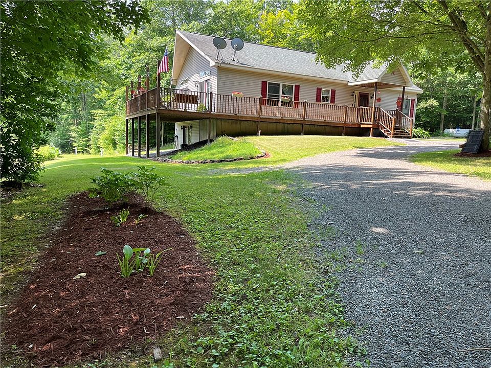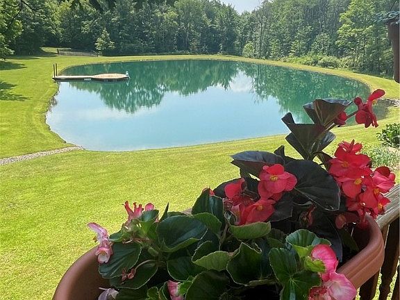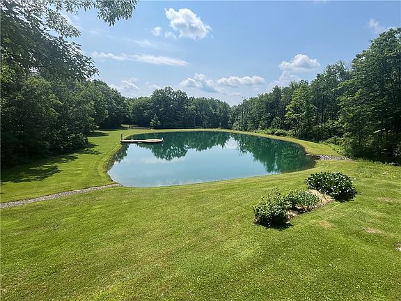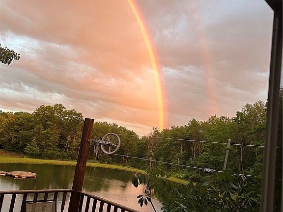 Are you looking for your private serene setting? Look no further. Picture yourself on your spacious deck overlooking the splendor and beauty zof the pond and surrounding area. Sit on your custom dock, toss a line in to catch a perch or just listen to the frogs and watch nature. The crystal clear spring fed water will refresh your body and mind. The property boasts 52.34 acres of woods, a field and manicured grounds. A spacious 3 bdrm, 3 bathrooms home, 2 bedrooms on the main level & 2 full bathrooms plus main floor laundry. Kitchen offers cooktop in the island and peninsula. Separately, there is a dining room connected to the living room with cathedral ceilings and abundance of natural lighting coming in the new French doors to view the outdoors. The lower level hosts ample space with 1 bedroom and full bath. Water hook up also in the wall for a wet bar. There is a spacious room for office or guests. Utility room with mechanicles along with plenty of shelving and utility sink. (Tax square footage does not include finished lower level.) Is this your next home at the end of the double rainbow? (see photos) Make an appt to view this amazing property. Motivated sellers!