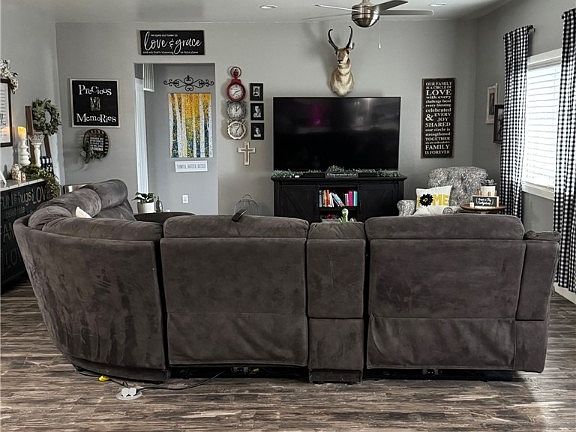 Pull through gatesQuartz counter topsTwo large covered patiosSliding glass doorLandscaping with grassOpen floor planCustomized island