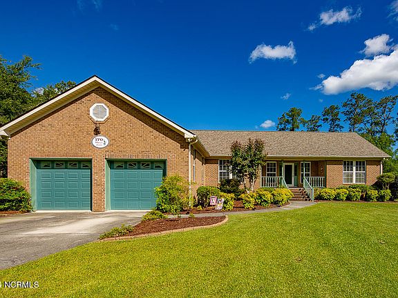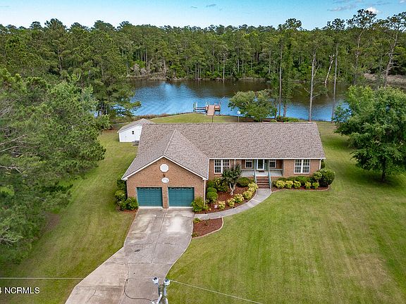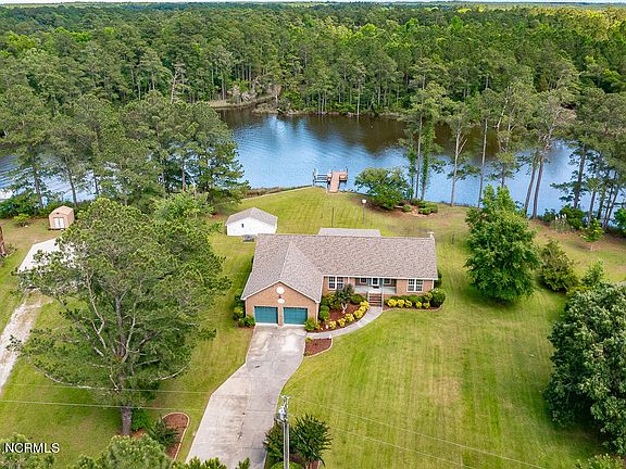 WATERFRONT 3-bedroom, 2-bathroom home situated on .89 acres in picturesque Pamlico County. This beautiful Merritt, NC property offers deep water access on Balls Creek with easy entry to the Bay River, perfect for boating enthusiasts. The home features a paved driveway leading to a two-door garage, surrounded by established flower beds and a welcoming covered porch. Inside, the open floor plan boasts vaulted ceilings and recessed lighting. The spacious living room seamlessly flows into the eat-in dining area and the renovated kitchen, which features white cabinets and tile floors and your appliances. Adjacent to the kitchen is a formal dining room for formal gatherings. The large utility room offers laundry hookups, cabinets and a sink making the chore of laundry a breeze! The expansive primary bedroom is a retreat with floor-to-ceiling windows, a walk-in closet, and farmhouse sliding doors leading to an en suite bathroom with a dual sink vanity, soaking tub, and walk-in shower. Two additional bedrooms share a full-sized bathroom. The screened-in porch has been transformed into a stunning 16x26 sunroom with ceiling fans, leading to a large wood deck overlooking Balls Creek. Additional features include a detached shed, a dock and pier for fishing and a ladder for swimming, as well as parts for a boat lift that potential buyers can restore! This home offers a perfect blend of comfort and waterfront living. 15 minutes to Oriental, less than 30 minutes to Minnesott Beach and less than 40 minutes to New Bern. SELLER IS OFFERING A 5,000 flooring credit. Don't miss out on this amazing opportunity.