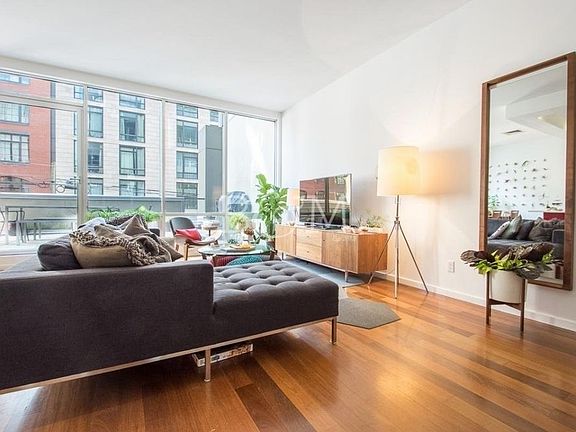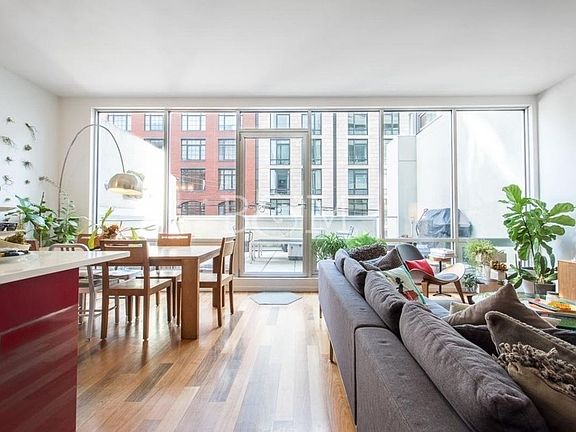 This exquisite home, centrally located on Williamsburgs Northside, offers everything you could dream of in a 2BR/2BA condo. This spacious apartment includes 1130SF of intelligently planned interior living space and an additional 853SF of coveted attached outdoor space. Upon entering the home, one immediately notices the oversized floor to ceiling windows allowing natural sunlight into the kitchen and living room and an attached 300SF terrace perfect for entertaining! The large living room easily fits an 8-12 person dining table, bar stools and a comfortable living room set-up. The Chefs kitchen boasts Caesar stone counter tops, high lacquered Italian cabinets with etched glass and top of the line stainless steel Bosch appliances. The south facing, amply sized bedrooms, easily fit queen size beds and look out onto a second 543SF terrace offering seclusion and views of lush greenery and prewar buildings, perfect for gardening, dining and lounging! The unit also maintains 2 bathrooms with custom finishes, lots of closet space, and impeccable Brazilian walnut hardwood floors throughout. The home comes fully equipped with central HVAC, a washer/dryer within the unit and a video intercom system. This condominium benefits from a 421(a) tax abatement currently in year 9 of 15 and low common charges making it a solid investment. Additionally, parking is included with this unit! The LUCENT Condominium is a 28 Unit boutique building with an elevator. The location could not be better with endless restaurants, shops and markets right outside your door, 1 block to McCarren Park, and 4 blocks to Bedford Avenue subway station and a short distance to the G train at Nassau Avenue.