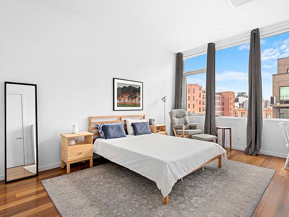 Apartment 5E at 170 N. 11th Street is a stunning floor-through two-bedroom, two-bathroom home nestled in the heart of Williamsburg. Upon entering, you're welcomed by an open floor plan designed for seamless living and entertaining. The expansive living, dining, and kitchen areas exude a loft-like ambiance, featuring soaring 11-foot ceilings and a dramatic 25-foot wall of floor-to-ceiling windows. The chef's kitchen boasts custom Italian cabinetry, high-end Bosch and Liebherr appliances, a full-sized refrigerator, and an oversized island with Quartz countertopsperfect for culinary creations. Oversized floor-to-ceiling windows in both the living room and bedrooms flood the home with natural light throughout the day. Ebony Brazilian walnut floors and crisp white walls frame the sleek, contemporary interiors. The master suite offers exceptional space and comfort, complemented by an en-suite bathroom with a custom double-sink vanity, wall-to-wall marble, and a walk-in shower. The spacious second bedroom easily accommodates a queen-sized bed and additional furnishings. The guest bathroom mirrors the master bath's modern aesthetic, featuring a deep soaking tub. Additional conveniences include central air and heating with a Nest Thermostat system, an in-unit washer/dryer, and a video intercom. Residents also enjoy premium building amenities, including a double roof deck with breathtaking 360-degree views of Brooklyn and Manhattan. The apartment includes a private parking space within the building (for an additional monthly fee). Situated just steps from vibrant Bedford Avenue, this condominium offers unparalleled access to Williamsburg's best attractions. McCarren Park is one block away, the Bedford L train is less than a five-minute walk, and the neighborhood's energy is at your doorstep. Experience the epitome of Brooklyn living in one of New York City's most dynamic neighborhoods!