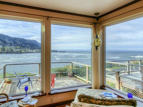 Spectacular Ocean, Bay and River Views in Charming remodeled home. This beautiful home has been remodeled top to bottom and it the perfect beach getaway and income property. Panoramic ocean and bay views from rooftop balcony engineered for a hot tub. Travertine Heated stone floors in kitchen with custom countertops and carefully selected appliances. Beautiful bath with custom slate shower and heated floors. Character and charm in premium downtown yachats location, walk to shops, restaurants, galleries etc. Vacation rental license has been applied for and is approved. Potential for between $35,000 and $55,000 gross income as a vacation rental.