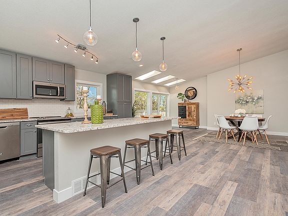 Newly remodeled including Pella windows, exterior paint, roof, chrome light fixtures, door handles & plumbing fixtures as well as new interior doors and modern base/window trim. Light & bright great room with vaulted ceilings & wood burning fireplace that opens to expansive kitchen/dining area. Blue Nile granite counters, island w/pendant lights, 42" gray shaker cabinets w/soft close hinges/drawers, a large pantry, tons of storage, gray stainless appliances, & mosaic subway tile back splash. Master has a slider to the back deck, his/hers closets, a sliding barn door that opens to the master bath with dual granite topped vanity w/under mounted sinks, custom soaking tub, & large shower. Two spacious additional bedrooms, a full bath and laundry room on the main level. Two more bedrooms, a bathroom and a large recreation area with a wood burning stove and a wet bar.