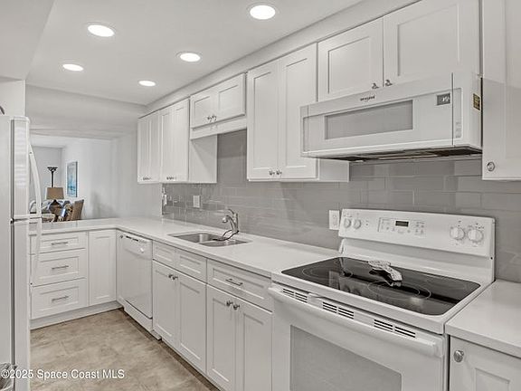 Available for the Season! No monthly rental. Welcome to Paradise! This gorgeous two bedroom, two and a half bath condo is tastefully updated and just a two minute walk to Paradise Beach (aka the local's beach). Featuring an updated kitchen with LED lighting, quartz countertops, white cabinets, tile back splash & floors. impact rated windows and brand new a/c system, new interior paint, slider blinds, plantation shutters, and plenty of storage space throughout. Both bedrooms are spacious, with private full baths & walk-in shower in master suite. Enjoy sunshine, surfing, & great rocket launch viewing, walk to restaurants, and shopping. Sip your coffee in the morning on your privare porch overlooking the beautifully maintained pool. From tennis courts, sauna and a shuffleboard court, activities abound. Offered turn-key furnished, bring your toothbrush and immediately begin to enjoy all that Florida beach life has to offe