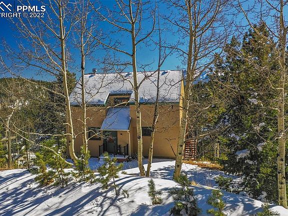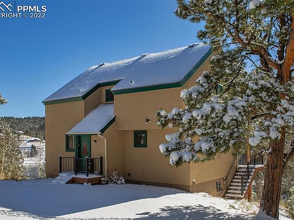 Stunning mountain home showcasing breathtaking, unobstructed views of Pikes Peak in all her glory. Recently updated stucco exterior, with composite decking and modern metal railings, while the interior has has recent upgraded luxury vinyl plank flooring throughout, new light fixtures, radon mitigation system, and bathroom upgrades. Lightly used as a second home and currently operating as a successful vacation rental, and located in the desirable neighborhood of Spring Valley in Divide, residents will enjoy stocked fishing lakes and a community water system. Expansive south and east-facing views from the 3 rear new decks, providing excellent passive solar heating. The main level of this home features a sunken living room with a cozy wood-burning fireplace and an open loft above, creating a warm and inviting gathering space. Kitchen and eat-in dining area sit just steps away while the main-level primary bedroom offers direct access to the rear deck and convenient connection to the hall bath. Upstairs, two additional bedrooms include a secondary owner-style suite with a walk-out Juliet balcony and access to a full hallway bath. The lower level offers a comfortable family room with walk-out access to the back patio, a game/recreation area, and an additional bedroom, adjacent a ¾ bathroom servicing this level. A dedicated laundry area and owner storage room complete this level. Natural gas services the hot water baseboard heating system for highly efficient heating. The property is situated on just over an acre along a county-maintained road, and includes an oversized detached two-car garage with ample extra storage. Located only 5 minutes from Pike National Forest, offering endless opportunities for hiking, horseback riding, motorcycling, and camping. Enjoy community trout fishing right at home, and easy access to world-class skiing in Breckenridge and Monarch—just 1.5 hours away. Outdoor adventure surrounds you in every direction. New boiler installed in 2023!
