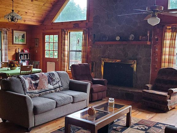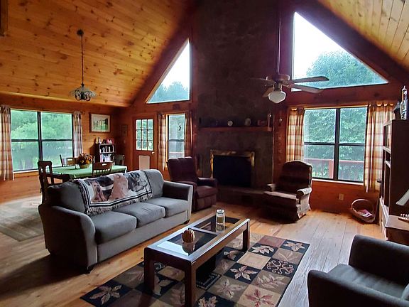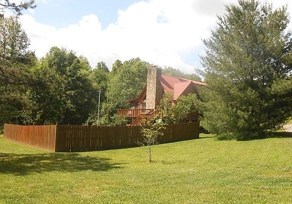 Lovely and spacious cabin-style mountain home in private river access community is situated on two lots with a wonderful little creek and level terrain. Home features open living space with dining area and stone fireplace plus a full two car garage. Ideal for pets with a pet door leading to fenced backyard.