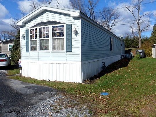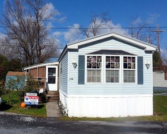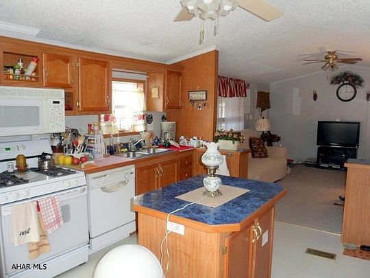 1997 Commodore 14x72 - 2 bedrooms, 1 bath, living room with vaulted ceiling, kitchen with island and appliances, large front window overlooking dining area with built in cupboards and counters on two sides, laundry with washer and dryer, spacious bedrooms and bath with double bowl sink. Nice, side screened in porch and shed. Tilted windows, new carpet and new galvanized roof. Included: NEW living room sofa, two reclining chairs and appliances. Lot rent is $272/mo, includes sewer, trash is separate $72 every 3 mo. Antis Township - Cul De Sac. Miller Ct., Lot 14.