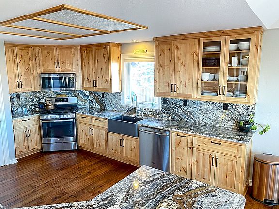 This rim-lot home has a view like no other, and is designed to fully embrace it. Overlooking the Chugwater Formation, with an abundance of wildlife (including eagle, deer, antelope, sandhill crane...), and boasting remarkable backyard privacy, this rare find is only two miles from west Cody. Over the past three years, the house has been almost entirely renovated, including the custom knotty-alder kitchen with granite countertops and backsplashes. Upstairs boasts a stone, gas fireplace, and downstairs a Vermont Castings Encore wood stove, sufficient to heat the whole house, if so desired. Full-log beams, architectural windows, an open floor-plan, and abundant natural lighting all serve to connect the indoors to the outdoors. This house must be experienced in person.