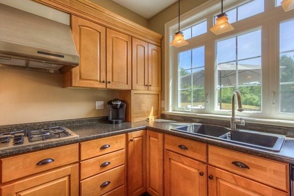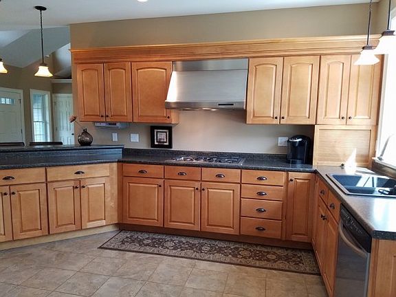 Pride of Ownership throughout this impeccably kept Contemporary Ranch featuring a very unique open concept floor plan! Cathedral ceilings in the family room w/ hardwood flrs and gas fireplace, bright and light kitchen w/ tons of natural light streaming in from the transoms and palladium windows, open to the dining room accented by beautiful shadow boxing, 9'ceilings featuring soft close cabinetry, stainless steel appliances including a 5 burner gas cook top and built in wall oven/microwave, double door large pantry, and breakfast bar. Master suite w/ private bath and large walk in closet with hand crafted organizers, first flr laundry, full walk out LL ideal for finishing additional living space/ play room, entertaining composite deck to enjoy, situated on a beautiful and fully irrigated 2 acre lot- set back from the road offering maximum privacy!