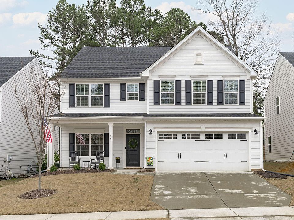 Pristine, better than new, North Facing home in coveted McCullers Walk! Rocking chair front porch greets you ''home''. Wide plank LVP flooring through the main level. Open-concept floor plan filled with natural light. Large kitchen with huge center island, granite countertops, chic tile backsplash, and stainless steel appliances featuring a built-in microwave, range hood, and 5 burner gas range. 1st floor guest suite with full bathroom. The sun-filled dining area opens to the grand family room. The inviting formal living room could be an additional dining space or a main-level home office. Huge primary bedroom with tray ceiling, his/her walk-in closets, and opulent en suite with dual vanity, private water closet, and oversized shower. Ample-sized secondary bedrooms and hall bath with double vanity. Lovely patio overlooking private and serene yard with wooded views! Excellent community amenities featuring indoor/outdoor pool, gym, game room, tennis, and basketball. Minutes to Costco and 540!