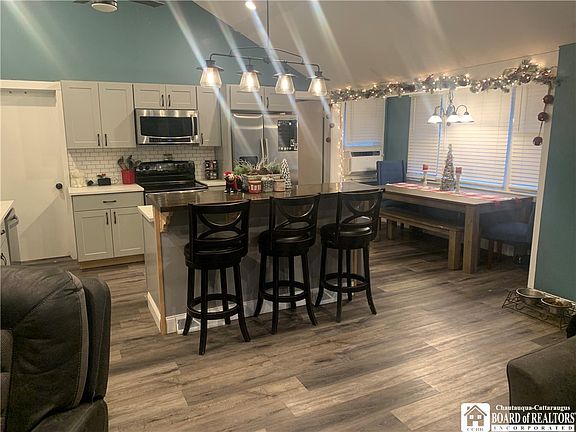 Quaint 3 bedroom home set back from the road. Many updates; Open floor plan with cathedral ceilings in living room and kitchen. Updated kitchen includes new cabinets, countertops, floors and appliances. Walk out basement leads to a concrete patio and a treated wood deck surrounded by a fenced in yard. Garage is built with a usable basement as foundation.