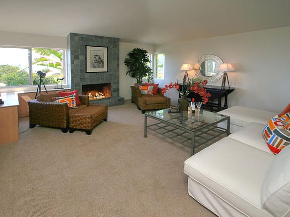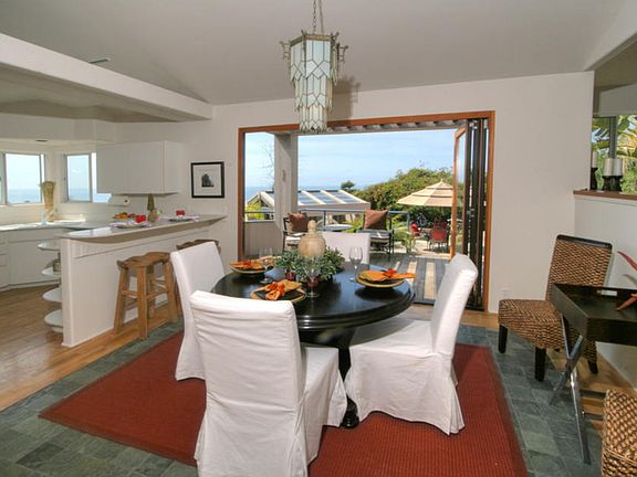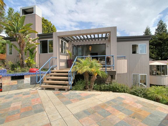Ocean views abound from this private, well kept contemporary 3 bedroom, 2.5 bath home. The open floorplan on the main level includes a spacious living room w/ vaulted ceiling, fireplace & built in cabinetry, dining room & kitchen w updated appliances & access thru a tri-fold glass door to the deck, large flat useable tiled patio & zen pavilion overlooking the blue pacific. The next level down is the Master Suite with high ceilings, fireplace, and turret shaped sitting room or office w/ ocean views. The master bath has a spacious glass enclosed shower, separate soaking tub and double vain, plus a walk in closet. The next level down is a sunny bedroom, and a hall bath, several stairs below this is a large bedroom with deck and access to a flat usable yard with stunning mature Redwoods, several citrus and avocado trees.