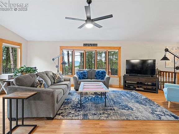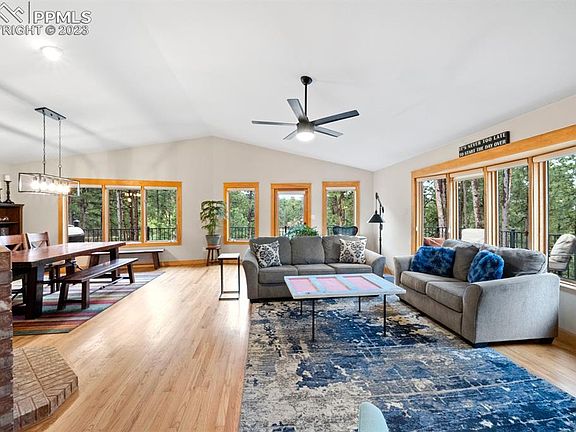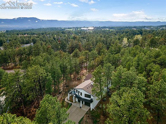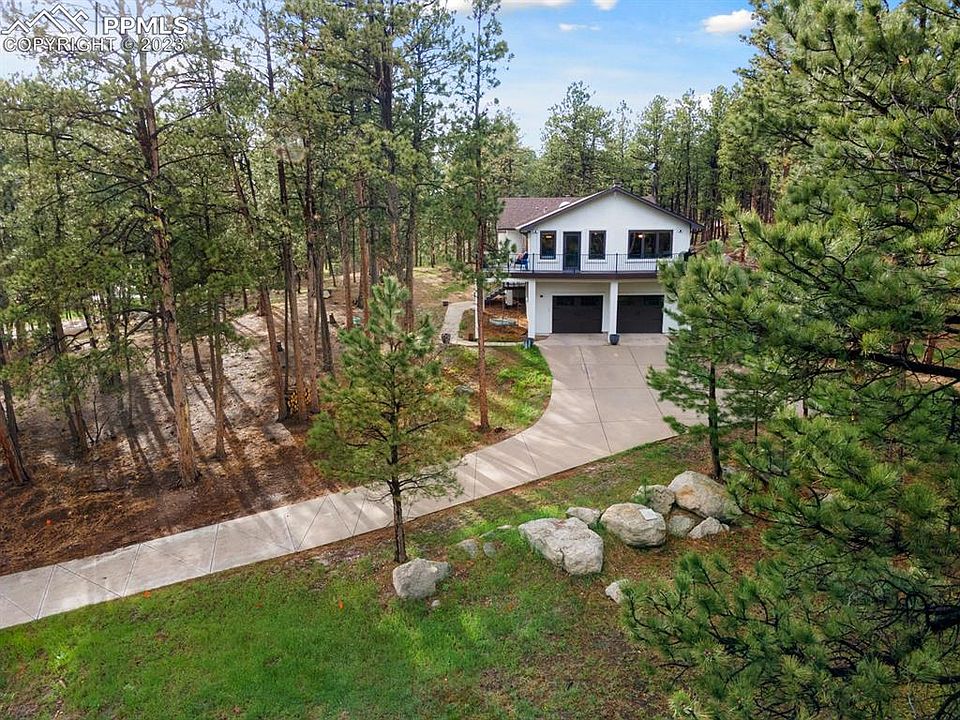 Gorgeous home on over 2 forested acres in Monument! This beautiful stucco home is surrounded by Ponderosa pines and rock outcroppings in a quiet, safe and friendly neighborhood. The exterior is freshly painted and has a wrap-around composite deck to relax and enjoy the view of Pikes Peak and the natural beauty. This home was recently updated, featuring open spaces with hardwood floors, new carpet and new tile. The main level has a large open living room/dining room with lots of natural light, high vaulted ceilings, oak floors, a double-sided gas fireplace and wood-cased bay windows and door to the deck. The new tile in the kitchen complements the granite counters, stainless-steel appliances, double oven, kitchen island with seating, large undermount sink, hardwood cabinets and upgraded lighting. The main level also features a Owners Suite with a bench seat in the window and a large walk-in closet with abundant drawers and shelving. The adjoining bathroom features gorgeous glass shower with dual shower heads, dual vanity with solid surface countertop and lots of cabinet storage! Bedrooms 2 and 3 are also located on the main level. There is a full-sized bath on the main level which features a gorgeous claw-foot soaking tub under a skylight. The lower level features a large family room with garden-level windows and a gas fireplace. There's a fourth bedroom/office with plumbing for a potential wet bar, garden-level windows and a large adjoining bathroom. The lower level laundry room has ceramic tile flooring, utility sink, cabinets and includes the washer and dryer. A short walk from the front door is a hot tub under the trees. The lot has a perimeter electronic pet fence and has been mitigated in accordance with FireWise.