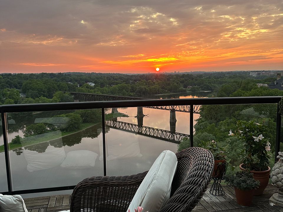 This One-of-a-Kind Luxury Penthouse was custom designed to create nearly 3,000 sq. ft. of refined living space, offering the perfect blend of elegance, comfort, and Panoramic River Views. Every window frames a breathtaking view of the river, and a full-length terrace with multiple walkouts provides a front-row seat to spectacular sunsets. The expansive and light-filled living room features a gas fireplace, seamlessly flowing into a grand dining area perfect for hosting a dinner party or large family gathering. The chefs kitchen is beautifully renovated and thoughtfully designed, with seating for five and overlooks the family room. A separate den offers the ideal space for a home office, home theatre, or additional third bedroom. Perfect for entertainers, the butlers pantry includes its own entrance, doubling as a service or catering kitchen for seamless hosting. The primary suite is tucked away in its own private wing, showcasing luxurious penthouse glamour with floor-to-ceiling windows and a walkout to the terrace. A spacious walk-in closet functions as a full dressing room complete with a center island. The show-stopping ensuite features a soaking tub positioned to take in the sweeping river views. The second bedroom is generously sized and includes its own ensuite bath, offering comfort and privacy for guests or family. With two underground parking spaces and two private locker rooms, this is elevated condo living without compromise. Set in the heart of historic Galt, you're just steps away from riverfront trails, fine dining at Cambridge Mill or Langdon Hall, the local farmer's market, and the vibrant Gaslight District. A rare opportunity to live large in one of the regions most desirable settings.