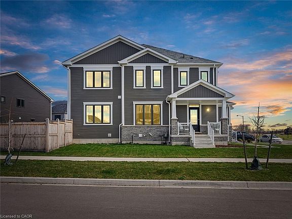 Discover this move-in ready corner-unit freehold townhome, built in 2022 and nestled in a growing, family-friendly neighbourhood just 30 minutes from Hamilton. Step inside to find thoughtful upgrades throughout, including quartz countertops, maple kitchen cabinets, upgraded appliances, and a single pot light -- providing an easy opportunity to install additional lighting. A striking oak staircase leads to the upper level, where the primary bedroom features a custom vanity with added height for enhanced comfort. The unfinished basement includes a rough-in for a 3-piece bathroom, offering future potential to expand your living area. Enjoy the practicality of an attached single-car garage and the bonus of having a park with tennis courts directly across the street. With a new Catholic and public school, as well as a community centre featuring 49 childcare spaces newly completed, this is a fantastic opportunity to become part of a welcoming and rapidly developing community.