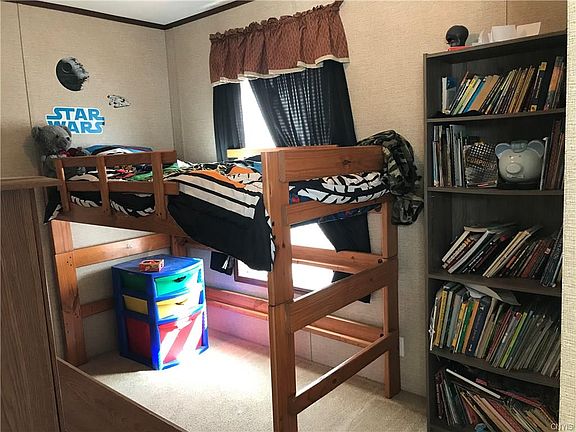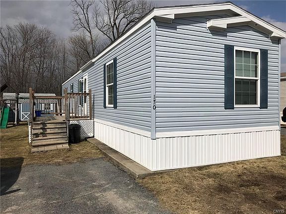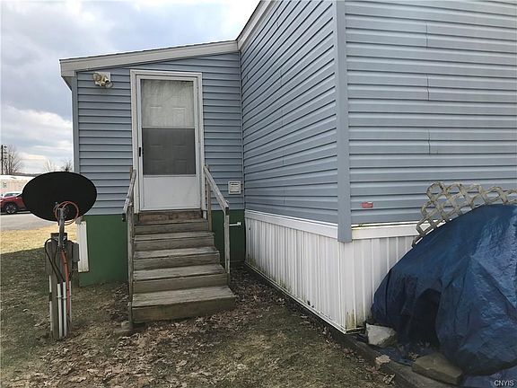 Newer single wide mobile home in a small village, well kept mobile home park. This home features upgraded wood cabinets throughout and a breakfast bar. An addition on the back and 2 sheds on the lot give tons of space for storage. Plenty of parking. Lot rent of $195/month includes village water and septic. Inexpensive, low maintenance living!