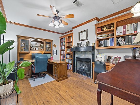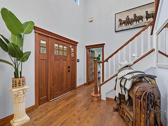 Country Retreat with gated entrance and on cul-de-sac. Beautifully updated 2 story home combining classic charm and modern updates. Nestled on a private, tree lined acreage, this property offers the perfect blend of indoor living and outdoor living. Step inside and you will find a warm and inviting layout featuring brick accents, tin ceiling, crown molding, see through fireplace and a spacious living area filled with natural light. Enjoy the large screened in porch that overlooks diving pool and hot tub. Updated kitchen boasts stainless steel appliances, dual ovens, white cabinetry, large center island and vibrant custom finishes that bring character and style to the heart of the home. 24x15 insulated shop with roll up door and side entry, 25x20 barn with 3 horse stall, chicken coop. Conveniently located with access to Hwy 199, FM 1886 or FM 730.