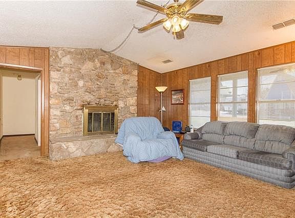 Split Level Home on Corner Lot. Nice trees, arbor with concrete patio, chain link fenced yard. Master suite is the top level and has a balcony and two walk in closets. Wood burning stone fireplace in the living. Utility room has cabinets and half bath. Location puts you close to just about everything. Old Republic Home Warranty in place.