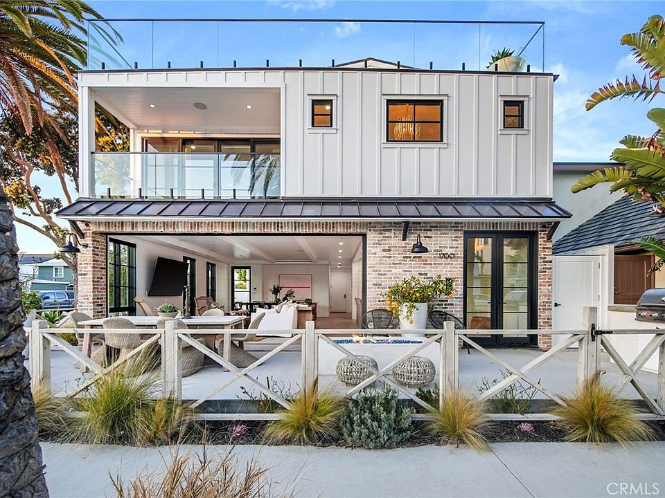 Stunningly warm coastal farmhouse enveloped by iconic palm trees, situated on an oversized wide corner lot on the prestigious Peninsula Point. Offers magnificent views spanning from the Pacific Ocean to Mount Baldy and is just steps from the sand. The 3-level home boasts pristine design and high-end finishes, including inviting white European oak floors outfitting the interiors, coupled with various specialty tiles throughout the bathrooms. Custom White shiplap walls add another appealing component to each floor in the house. A chef’s kiss to the kitchen, it is topped with Calacatta marble and designer brass hardware with a large cascading waterfall island, large farmhouse sink, sleek white cabinets, and high-end appliances. The main level, with an open floor plan, comes replete with an airy and light-filled living area, a spacious dining area accentuated by a rustic white brick feature wall, cozy bar area, laundry room with double stacked appliances and powder bath. The custom pocket doors open the main level to the lower terrace boasting a fire pit, grill, and plenty of space for entertaining guests. The sleek primary suite includes large private balcony with breathtaking ocean view, spacious walk-in closet and a luxurious spa bathroom with dual vanities, a large soaking tub, oversized walk-in shower clad in marble and encased in glass doors, custom wood cabinetry with marble countertops, chic herringbone tile flooring, and mood lighting. The three spacious guest bedrooms luxuriate custom features throughout with one enjoying its own private balcony. The upper level has a custom-built minibar and a full bathroom complete with signature red-bricked walls. Behind folding glass doors, this level opens up to arguably the largest roof deck in the area. The magnificent 1,000+ sq. ft. rooftop terrace is truly an entertainer's dream with its multiple covered and uncovered lounging areas, fire pit, and a built-in grill and mini fridge, overlooking the ocean, city and snowcapped mountains. A 3-car garage with Tesla/charging port, Sub-Zero fridge completes this rare offering, making it one of the best options out there for any discerning buyer.