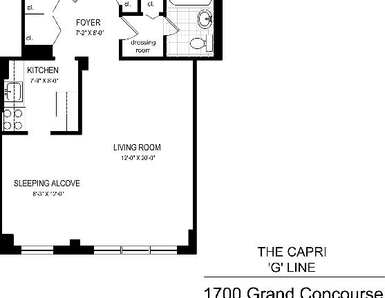 Incentive: 2.0 month(s) free on a 12 month lease. The gross rent reflected on the lease agreement is $2,259 and the net effective rent is $1,882. (Promotions apply to new residents and immediate move-ins only.) No-fee studio apartment located on the Grand Concourse in The Bronx. Apartment features a large living space with separate sleeping alcove, hardwood floors, and abundant closet space. The Capri is a 24-hour doorman building with amenities including an on-site parking garage and elevator. Images displayed are of exact apartment. Floorplans may reflect either a model unit or comparable apartment with a similar layout and/or finishes. The actual apartment floorplan may slightly differ.