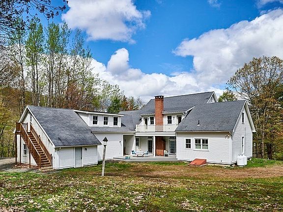 Love at first sight! This striking contemporary farmhouse on a gentle hillside overlooks 10+ parklike acres with over 100 blueberry bushes. It is a must see! Built in 1998, it is spacious and gracious with everything today''s buyers are looking for. Bright and airy, the first floor has 10ft ceilings and solid birch floors. There is a large central family room with beautiful Ashfield stone hearth, fireplace and french doors, a sweet country kitchen with pantry, formal and informal dining spaces, a sunny primary suite with tub & shower, generous walk in closet and accessible features, laundry room, mudroom and a bonus room that could be home office/music/media/game room? Upstairs there are 3 more bedrooms and a full bath, along with a studio wing with its own kitchen, laundry and entry. Room for expansion over 3 car garage. Freshly painted wrap around porch and decks. Trustees of Reservations land with trail to Chapel Falls at rear of property! 15mins to Williamsburg, 25 to Northampton.