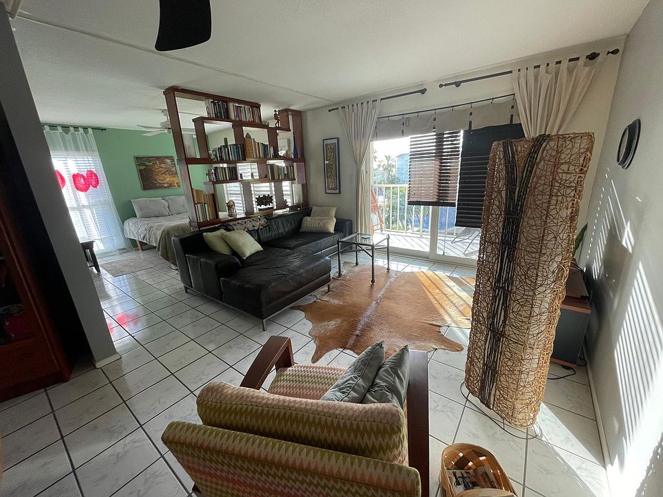Master bedroom and living room are open, only divided by a custom made ceiling to floor bookshelf. This gives it an open and airy feeling and lets the wind flow freely through the house.