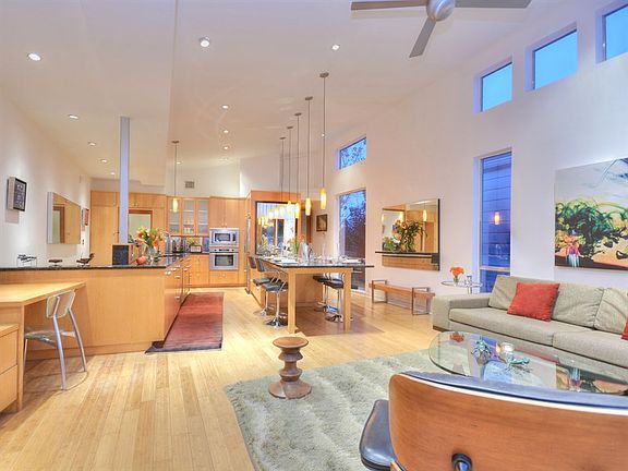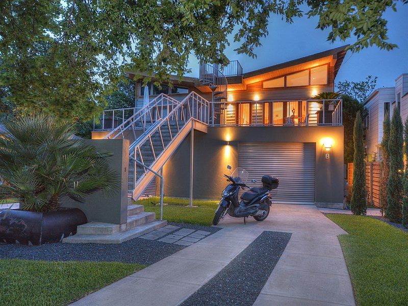 Architectural gem with kinetic plan! Easily accessible to I-35, Mopac/Loop 1, Hwy 290, and 71. Modern design 3 bedroom, 2 bath condominium with city skyline view. Integrated kitchen & dining with granite counters, Bosch kitchen package, high-end cabinetry, sinks, fixtures and knobs, hand-blown glass drop lighting, bamboo floors, venetian plaster accent walls, seamless millwork, and custom door in upstairs suite. Two decks including a rooftop view of downtown Austin and private backyard.