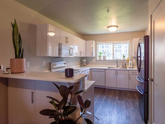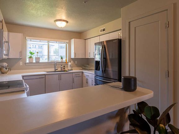 Clean, modern condo on main level. Adjoining family room, dining room, and stylish kitchen with solid surface countertops, white cabinetry and appliances, and laminate hardwood flooring. Large master bedroom with tons of closet space and lots of natural lighting. Big bathroom, secondary bedroom, washer/ dryer hookups, and popular gray/ white color scheme throughout the home.