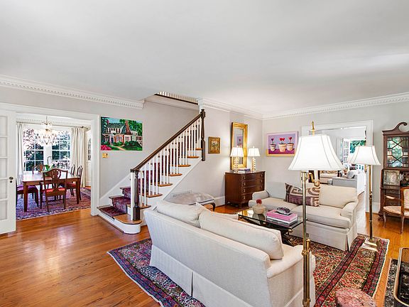 Set on a corner lot in Hayes Barton, this classic Dutch Colonial home blends traditional charm with modern comforts. Built in the late 1920s by Howard E. Satterfield, this impressive residence with a green clay tile and metal roof offers a rare opportunity to own a true architectural gem. An inviting foyer opens into spacious formal living and dining rooms adorned with intricate dentil molding, hardwood floors, and abundant natural light. The living room showcases a striking black marble fireplace and seamlessly transitions into a sun-drenched sunroom/office with French doors. The dining room boasts a crystal chandelier, classic built-in corner cabinets, and oversized windows. The updated white kitchen combines modern functionality with classic style, featuring custom cabinetry, granite counters, stainless appliances, a gas cooktop, and a cozy built-in breakfast nook with a bay window. The main-level family room provides relaxed elegance with built-ins, a second fireplace, and French doors that lead to an amazing wraparound covered porch—perfect for morning coffee or evening cocktails. A grand staircase with a traditional runner anchors the home and leads to the second floor. Upstairs, the primary suite with dual closets includes an en-suite bathroom with dual marble vanity, custom cabinetry, laundry shoot, marble herringbone heated floors, and a large marble and tile walk-in shower with a glass-block window for natural light and privacy. Two additional bedrooms upstairs provide comfort for guests or family, with white marble and tile en-suite bathrooms and dual closets. The finished basement is a standout feature. It is fully paneled in warm wood, with built-in bookshelves and private bathroom access—ideal for use as a guest suite, recreation room, home office, or media space. The lower level adds invaluable flexibility. Outside, the manicured lawn with sprinkler system, white picket fenced back yard, brick pathways, one-car garage and carport, and symmetrical façade create eye-catching curb appeal. Located in Raleigh's desirable Hayes Barton neighborhood, this home is just minutes from parks, shops, and dining, yet it feels like a serene escape steeped in charm and tradition. You don't want to miss out on this much loved home inside the beltline!